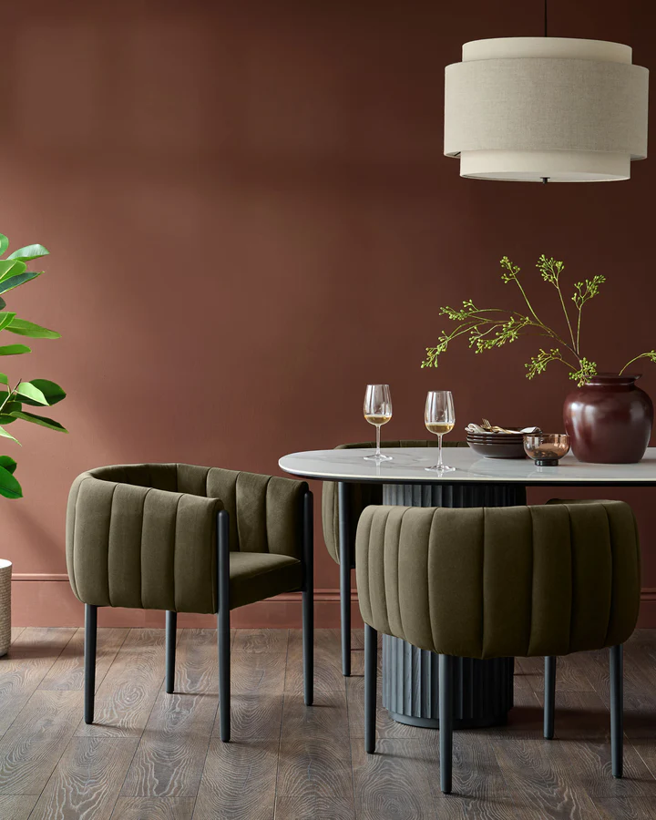 Ghế ăn bọc vải màu xanh ô liu Cole là điểm nhấn phong cách cho bất kỳ không gian ăn uống nào. Các chi tiết uốn lượn được may thủ công tạo thêm kết cấu phong phú cho thiết kế, tạo nên vẻ ngoài bồng bềnh, vừa vặn tuyệt đẹp. Được bọc bằng vải nhung tái chế mịn màng, chiếc ghế này mang đến sự thoải mái sang trọng và nét thanh lịch. Chân ghế bằng thép sơn tĩnh điện liền mạch tạo nên hình dáng điêu khắc, trong khi bộ bảo vệ sàn có thể điều chỉnh kín đáo đảm bảo sự ổn định trên mọi bề mặt. Được thiết kế với chiều cao ghế ngồi vừa vặn thoải mái dưới hầu hết các bàn ăn, ghế ăn Cole giúp bạn có tư thế ngồi tốt hơn và khiến những bữa ăn dài, thư thái trở nên thú vị hơn. Kết hợp với bàn ăn và ghế dài bổ sung để tạo nên một khu vực ăn uống gắn kết và hấp dẫn.