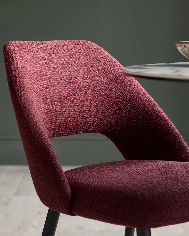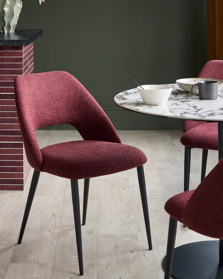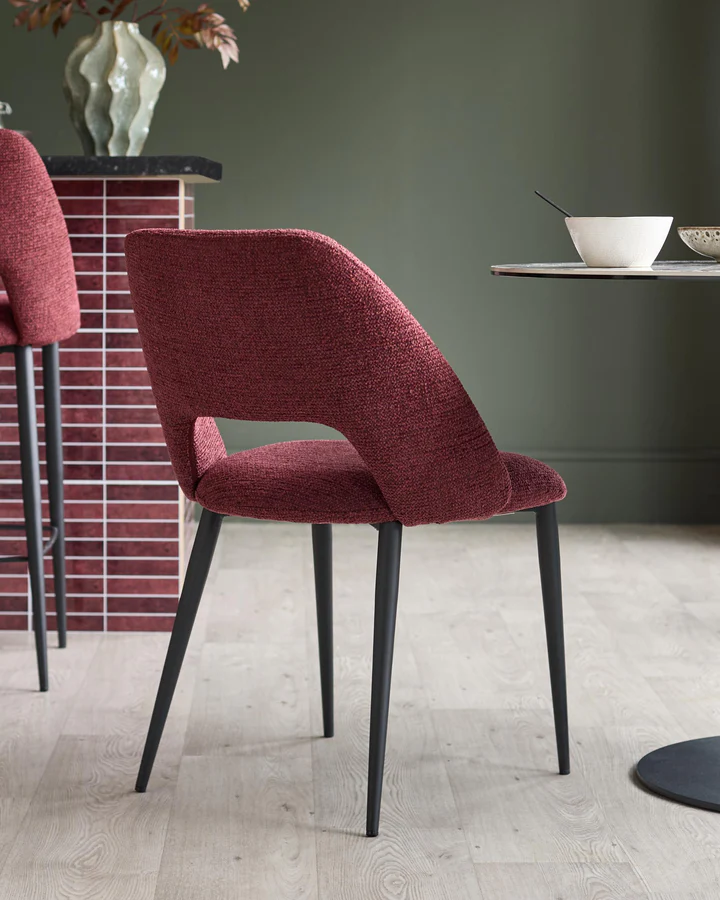 Ghế ăn vải Lottie màu đỏ mọng tạo điểm nhấn sống động cho bất kỳ không gian ăn uống nào. Phần tựa lưng được chạm khắc tinh xảo và mặt ghế cong mềm mại, kết hợp với vải nhung họa tiết phong phú, mang đến sự thoải mái và phong cách. Sắc đỏ mọng đậm đà mang đến sự ấm áp và điểm nhấn thị giác thú vị. Chân kim loại đen sơn tĩnh điện tạo nên sự tương phản nổi bật đồng thời đảm bảo độ chắc chắn. Tấm bảo vệ sàn tích hợp mang đến sự tiện dụng mà không làm giảm đi vẻ đẹp thẩm mỹ của ghế. Được bán theo cặp, những chiếc ghế đa năng này phù hợp với nhiều phong cách ăn uống khác nhau, từ phong cách tối giản đến hiện đại giữa thế kỷ. Hãy cân nhắc kết hợp chúng với bàn ăn gỗ sồi sáng màu và thảm trải sàn họa tiết để tạo nên một không gian ấm cúng và hấp dẫn.
